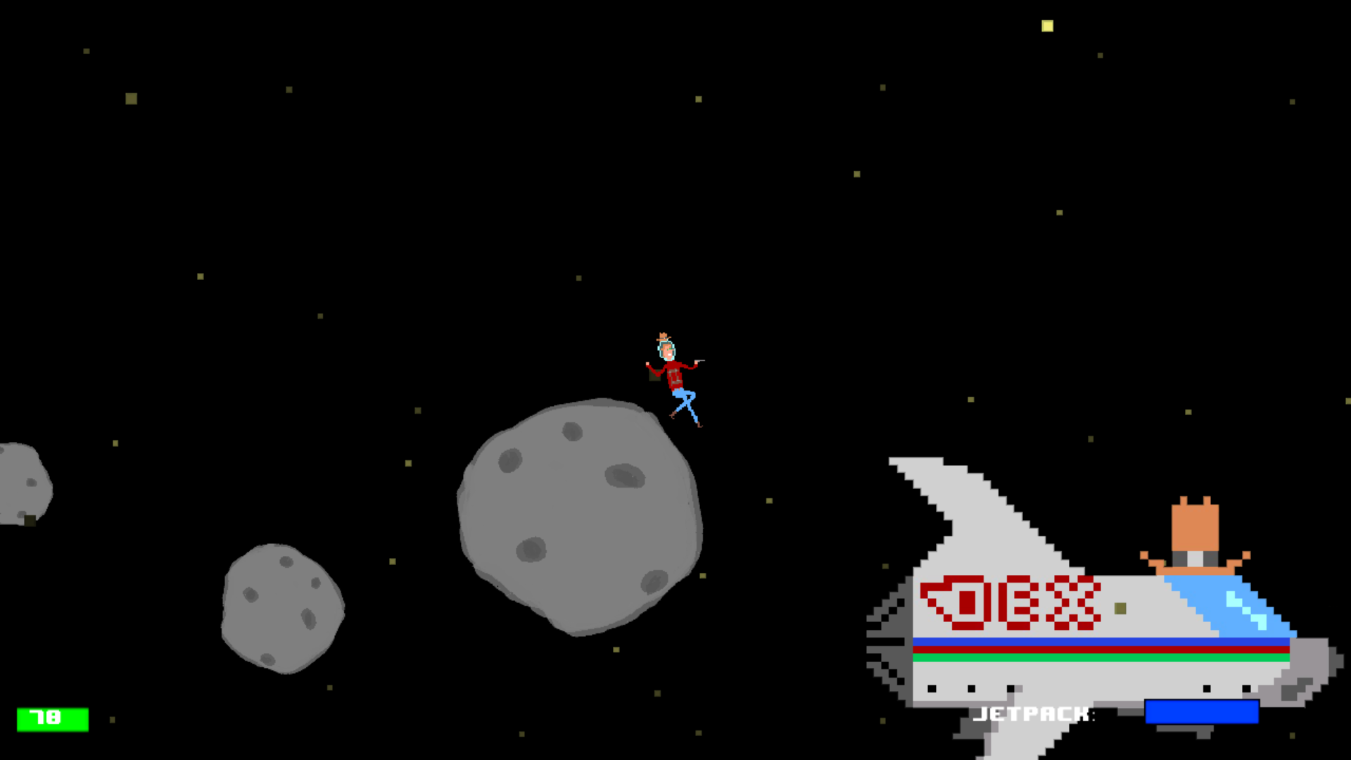Keyboard: A D to move left and right, space to jump, left control to shoot. Press space while in the air to start flying but watch your fuel, W S to move up and down while flying. Gamepad controls are recommended.